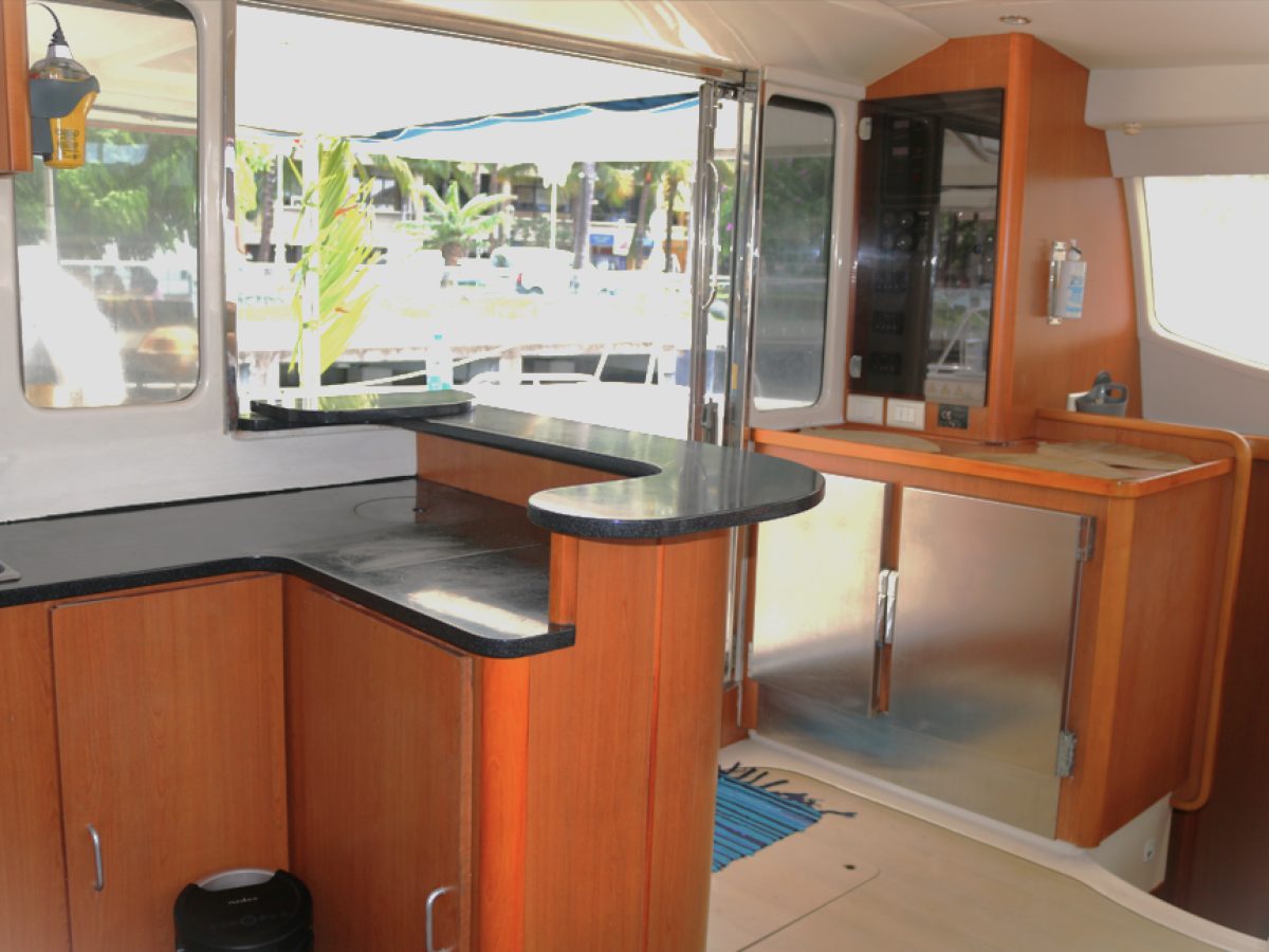 Our last boat arrived with it’s fly bridge, a reel innovation on a 44 feet catamaran, which allows us to admire Polynesia with a higher up view. It will surprise you by it’s outside living spaces, it’s front cockpit and it’s performances under sail. the insides are very functional and welcoming.